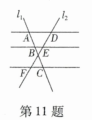 11. 如图,$AD// BE// CF$,直线$l_1$,$l_2$与这三条平行线分别交于点$A$,$B$,$C$和点$D$,$E$,$F$,$\frac{AB}{BC}=\frac{2}{3}$,$DE = 6$,则$EF =$_______.