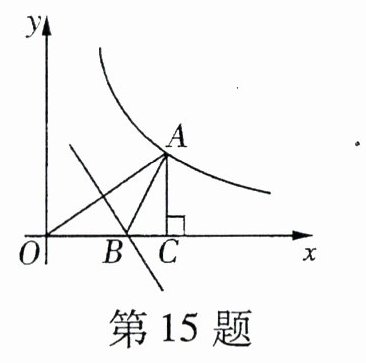 15. 如图,点$A$在双曲线$y=\frac{\sqrt{3}}{x}(x>0)$上,过点$A$作$AC\perp x$轴,垂足为$C$,$OA$的垂直平分线交$OC$于点$B$,当$AC = 1$时,$\triangle ABC$的周长为_______.