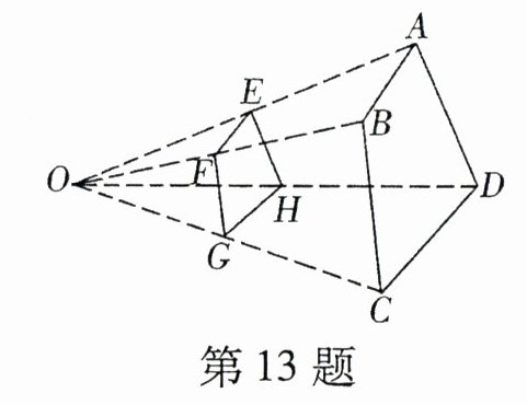 13. 如图,四边形$ABCD$与四边形$EFGH$位似,位似中心点是$O$,$\frac{OE}{OA}=\frac{3}{5}$,则$\frac{FG}{BC}=$_______.