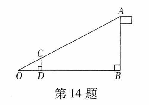 14. 如图,数学活动小组为了测量学校旗杆$AB$的高度,使用长为$2\text{m}$的竹竿$CD$作为测量工具. 移动竹竿,使竹竿顶端的影子与旗杆顶端的影子在地面$O$处重合,测得$OD = 4\text{m}$,$BD = 14\text{m}$,则旗杆$AB$的高为_______$\text{m}$.