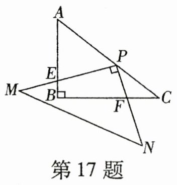 17. 如图,在$Rt\triangle ABC$中,$\angle ABC=90^{\circ}$,$AB=3$,$BC=4$,在$Rt\triangle MPN$中,$\angle MPN=90^{\circ}$,点$P$在$AC$上,$PM$交$AB$于点$E$,$PN$交$BC$于点$F$,当$PE = 2PF$时,$AP = $_______.