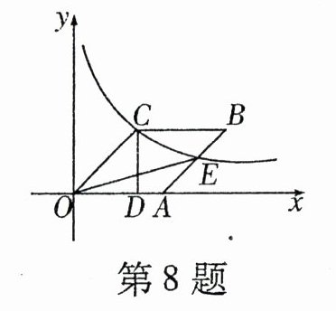 8. 如图,已知四边形OABC是菱形,CD⊥x轴,垂足为D,函数$y = \frac{4}{x}$的图象经过点C,且与AB交于点E. 若OD = 2,则△OCE的面积为( )