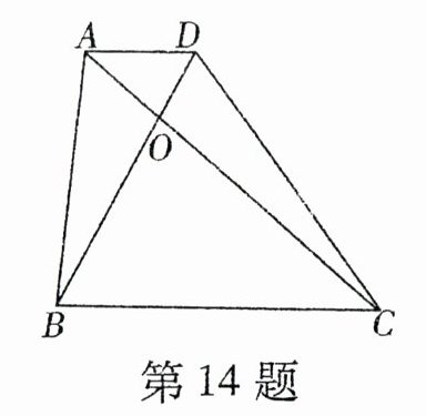 14. 如图,梯形ABCD中,AD//BC,AC,BD交于点O,$S_{\triangle AOD}:S_{\triangle COB}=1:9$,则$S_{\triangle DOC}:S_{\triangle BOC}$ = _______.