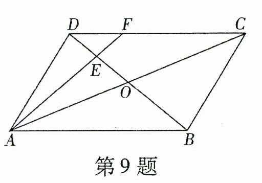 9. 如图,在□ABCD中,AC与BD相交于点O,E为OD的中点,连接AE并延长交DC于点F,则$S_{\triangle DEF}:S_{\triangle AOB}$的值为( )