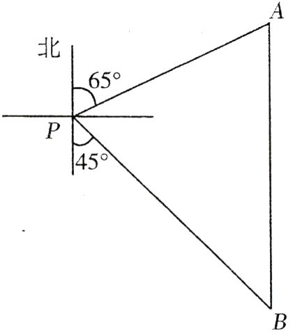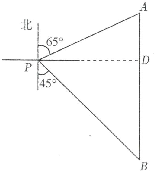 解:过点$P$作$PD\perp AB$于点$D$. 由题意知$\angle DPB = 45^{\circ}$. 在$Rt\triangle PBD$中,$\cos45^{\circ}=\frac{PD}{PB}$, $\therefore PB=\frac{PD}{\cos45^{\circ}}=\sqrt{2}PD$, $\because$点$A$在点$P$的北偏东$65^{\circ}$方向上, $\therefore\angle APD = 25^{\circ}$. 在$Rt\triangle PAD$中,$\cos25^{\circ}=\frac{PD}{PA}$, $\therefore PD = PA\cdot\cos25^{\circ}=80\cdot\cos25^{\circ}$, $\therefore PB=\sqrt{2}PD=\sqrt{2}\cdot80\cdot\cos25^{\circ}=80\sqrt{2}\cos25^{\circ}$.