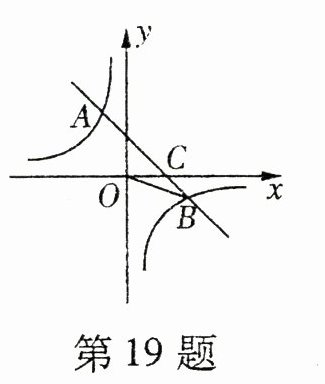 19. 如图,在平面直角坐标系中,一次函数$y = ax + b(a\neq0)$的图象与反比例函数$y = \frac{k}{x}(k\neq0)$的图象交于二、四象限的$A$,$B$两点,与$x$轴交于$C$点. 已知$A( - 2,m)$,$B(n, - 2)$,$\tan\angle BOC = \frac{2}{5}$,则此一次函数的解析式为____________.