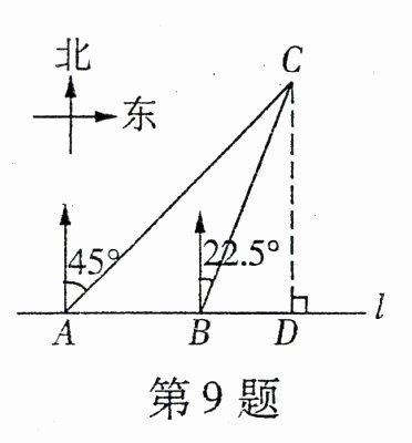9. 如图,在一笔直的海岸线$l$上有$A$,$B$两个观测站,$AB = 2km$. 从$A$测得船$C$在北偏东$45^{\circ}$的方向,从$B$测得船$C$在北偏东$22.5^{\circ}$的方向,则船$C$离海岸线$l$的距离(即$CD$的长)为( )