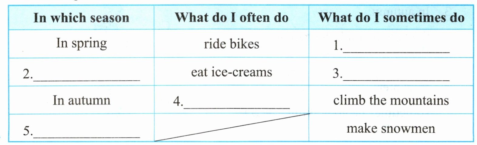 3. go swimming (with my friends) 4. eat many fruits 5. In winter