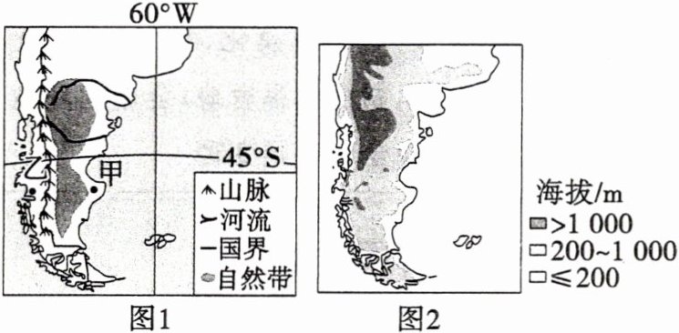某地理研学小组围绕南美洲南部地形、气候、植被等方面,对不同区域的自然环境进行了对比分析,通过查阅相关资料,发现南美洲南部的东西部降水量差异较大,其中甲地年降水量低于200mm,乙地年降水量则超过2000mm。图1为南美洲南部某自然带分布示意图,图2为南美洲南部地形简图。