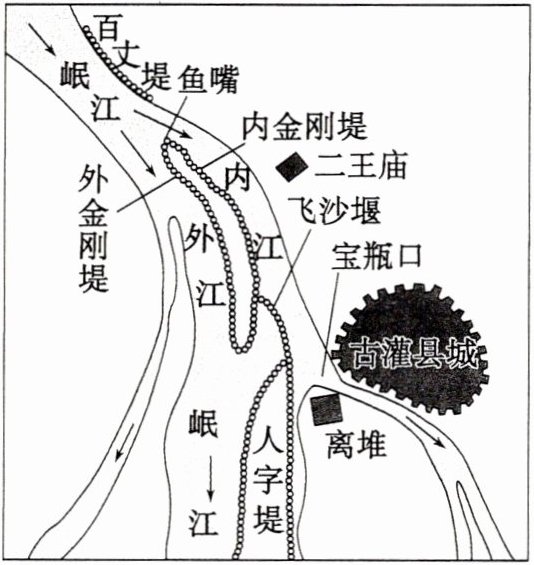 都江堰位于岷江由山谷河道进入成都平原的位置。古代成都平原旱涝频繁,李冰父子主持修建了都江堰水利工程,在玉垒山凿出宝瓶口引水东流,并用竹笼装满鹅卵石,在岷江河湾江心处筑堰分水,堰如鱼嘴,将岷江分为内江和外江。外江宽而浅,内江窄而深,科学地解决了江水自动分流(四六分水——内江在枯水期分走六成江水,外江在洪水期分走六成江水)和自动排沙(二八分沙——八成泥沙被外江排走),以及利用宝瓶口与飞沙堰控制进水量和二次排沙等问题。2000多年来,都江堰水利工程“引水以灌田,分洪以减灾”,使成都平原成为水旱从人、沃野千里的“天府之国”。下图是都江堰水利工程示意图。