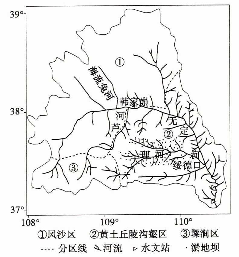 (3)读图可知,大理河流经黄土丘陵沟壑区,地势起伏较大,夏季多暴雨,水土流失严重,因此,大理河流域修建了大量的淤地坝,由于20世纪50年代起,无定河流域就已经开始建设淤地坝工程,设计寿命为10 ~20年,到20世纪90年代,大理河流域的淤地坝淤满,导致拦蓄径流的作用减弱,河流水量增多;加上流域内农业种植结构的调整,种植耐旱等需水量少的作物,农业灌溉引水量减少,导致河流径流量有所回升。