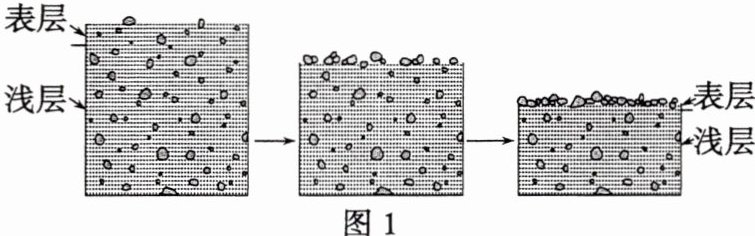 风蚀粗化是风蚀导致地表松散层细颗粒物流失、粗颗粒物所占比例增加的现象,其过程如图1所示。某科研小组通过比较地表松散层表层和浅层的粗、细颗粒物含量,构建了风蚀粗化指数。该指数数值越大,说明表层比浅层粗颗粒物含量越高。图2显示青藏高原南部(针对风蚀)采样点粗化指数的分布。