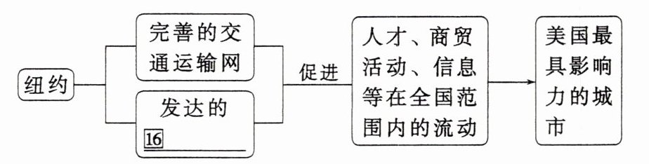 3. 对城市带的影响:纽约与其他城市之间通过便利的高速公路和航空线路紧密联系,各城市分工协作,形成了以⑮________等服务业为主导,同时又各具特色的产业体系。