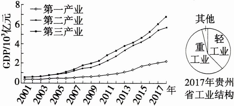 自2000年我国实施西部大开发战略以来,贵州省经济得到了长足发展,GDP快速提升,但第一产业就业比依然高达55.54%(2017年)。为进一步优化产业结构,促进社会经济发展,有专家提出了“进一步扩大轻工业的产业规模,引进高新技术产业,通过技术来拉长工业产业链”等建议。下图示意贵州省2001—2018年三次产业产值变化和2017年工业结构组成。