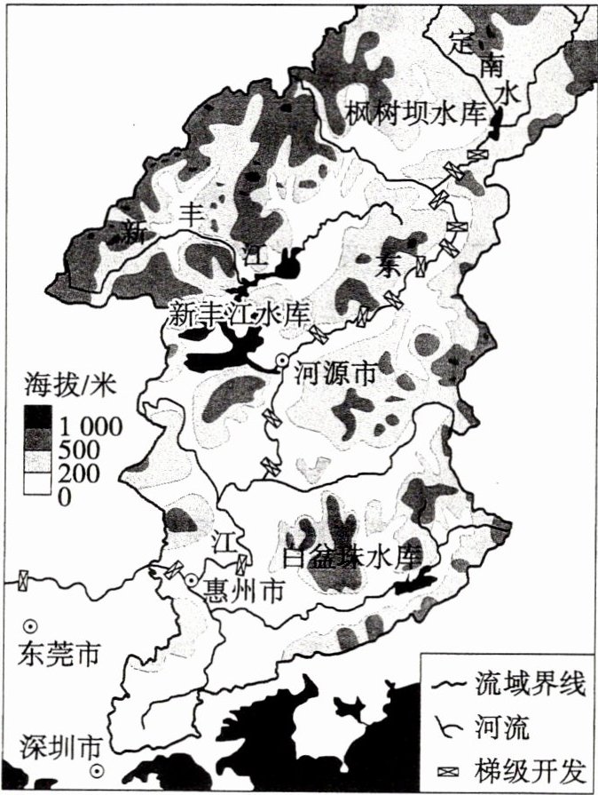 (2)梯级开发,即多级水电站,其优势可从自然条件和社会经济条件分析。东江位于亚热带季风气候区,区域内降水较为丰富,流量大,发源于南岭,上游落差大,流速快,水能资源丰富;上游发源于南岭,多峡谷,筑坝工程量小,建设投资少;东江临近珠三角地区,珠三角人口密集,经济发达,电力需求量大,电力输送距离短。
