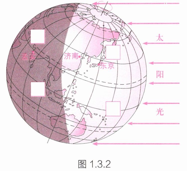 (2)在图1.3.2中填写“黑夜”和“白天”,并按要求填空。