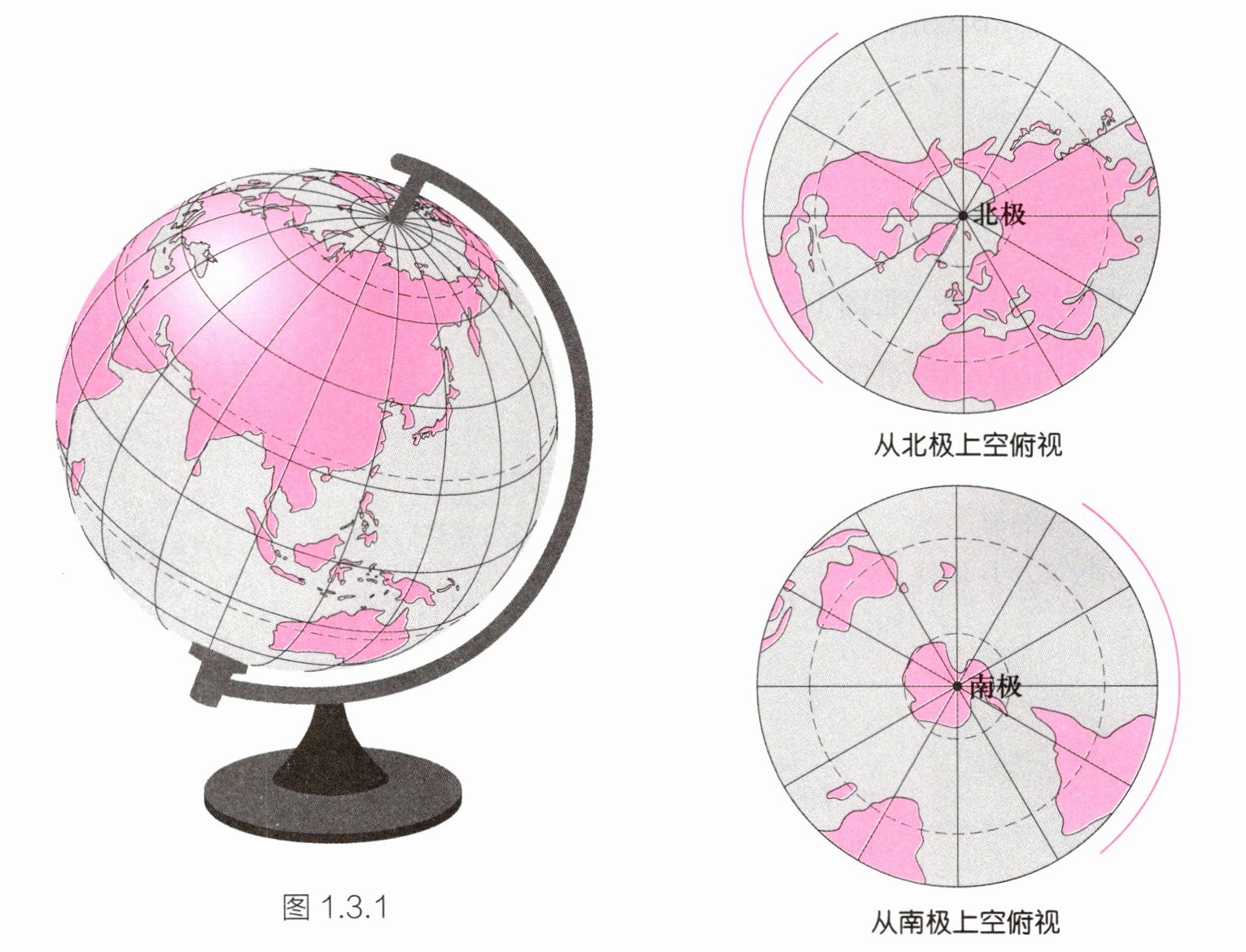 (1)在图1.3.1的三幅图中分别绘出地球的自转方向。