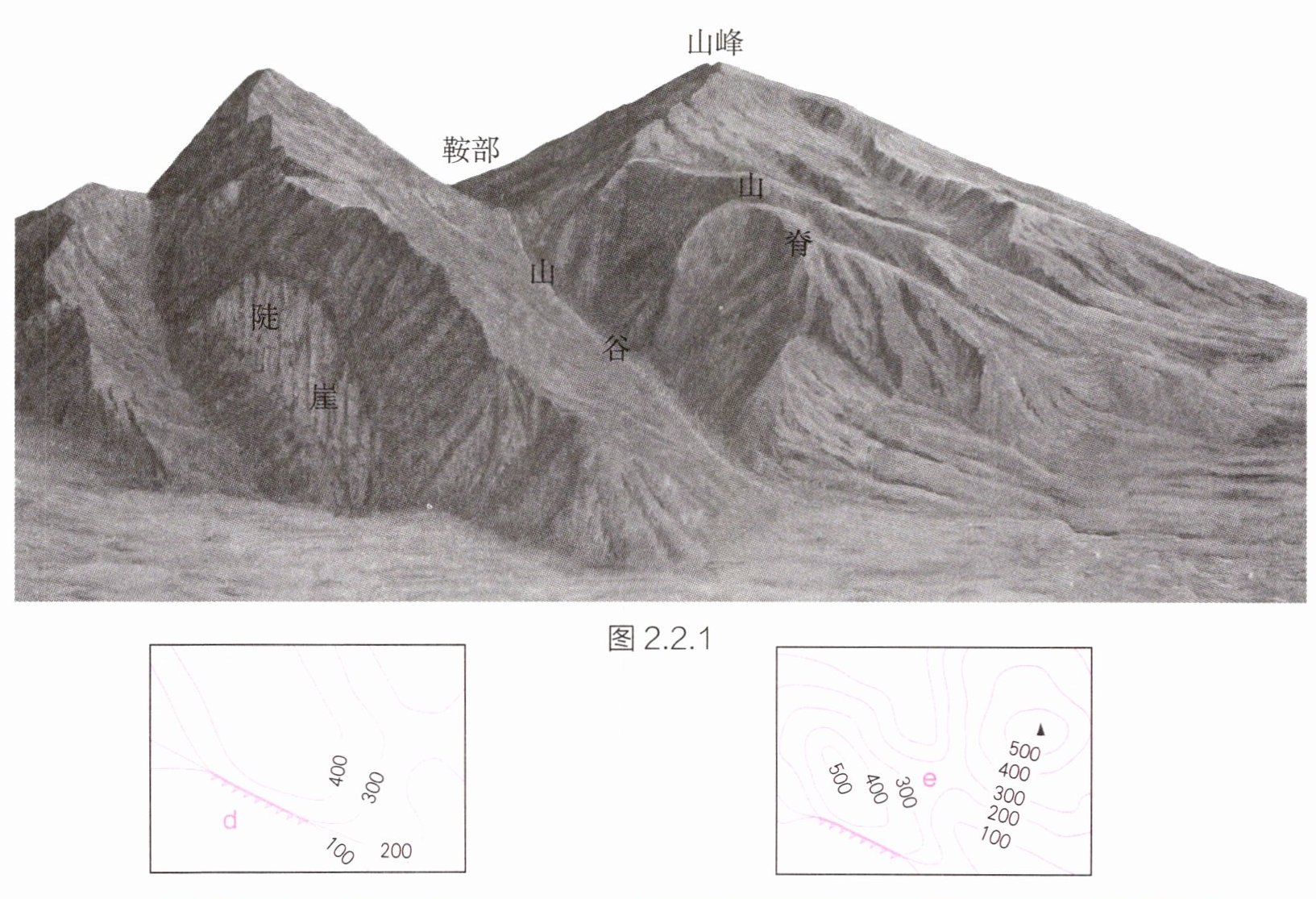 读图2.2.1,将等高线地形图中字母表示的地形部位与素描图中的对应部位连线,比较山体不同地形部位的等高线特点并填空。