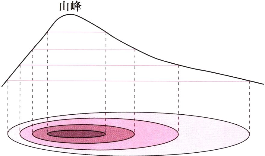 山地:等高线密集、弯曲,海拔在 500 米以上 盆地:周围等高线密集,内部稀疏,呈闭合曲线,中间低、四周高 丘陵:等高线较稀疏、较曲折,海拔低于 500 米 平原:等高线稀疏、平直,海拔在 200 米以下