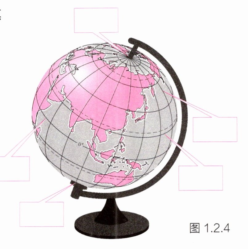(2) 在图1.2.4中填写:北极、南极、赤道、经线、纬线。