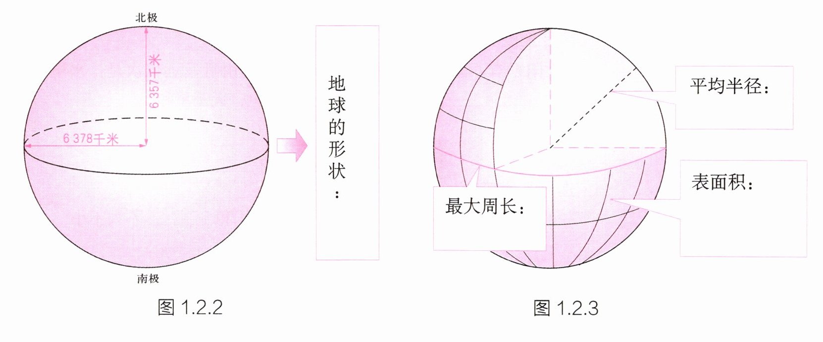 (1) 根据图1.2.2归纳地球的形状,并在图1.2.3的字框中填出表示地球大小的数据。