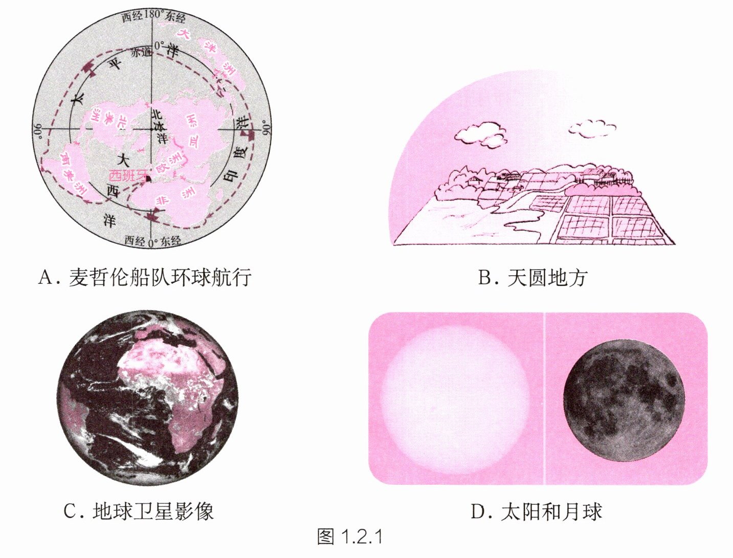在图1.2.1的四幅图之间标画箭头,体现人类认识地球形状的过程。