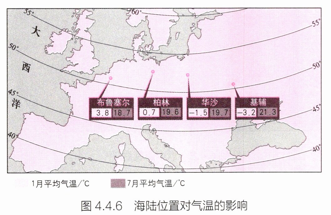 (2)图中自西向东的气温变化说明:同纬度地区,冬季内陆地区的气温比沿海地区______(高或低),夏季内陆地区的气温比沿海地区______(高或低)。试说明导致这种差异的原因。