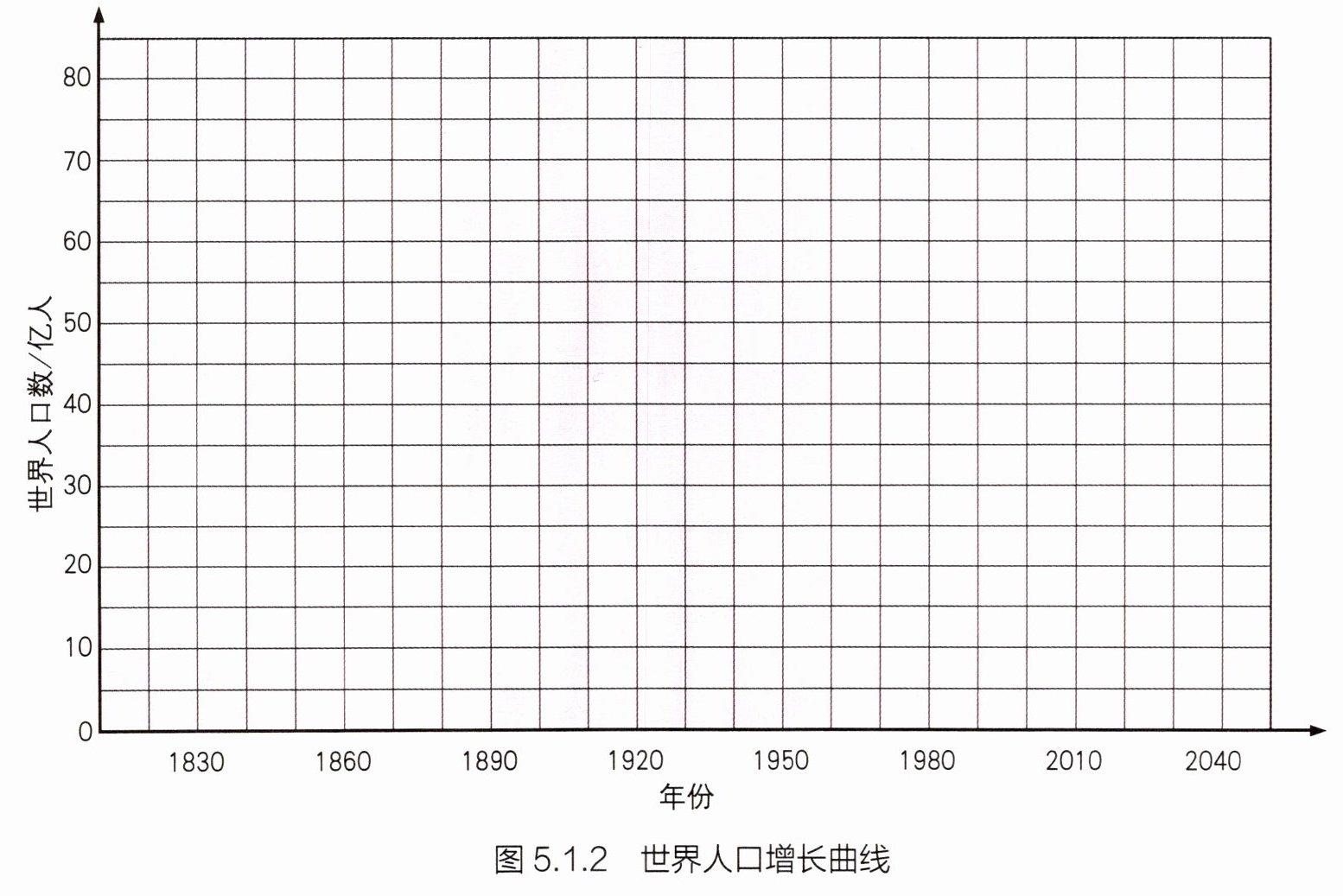 (2) 根据图5.1.1,在图5.1.2中绘制世界人口增长曲线。绘制完成后,用曲线图验证表5.1.1中填写的内容是否正确。