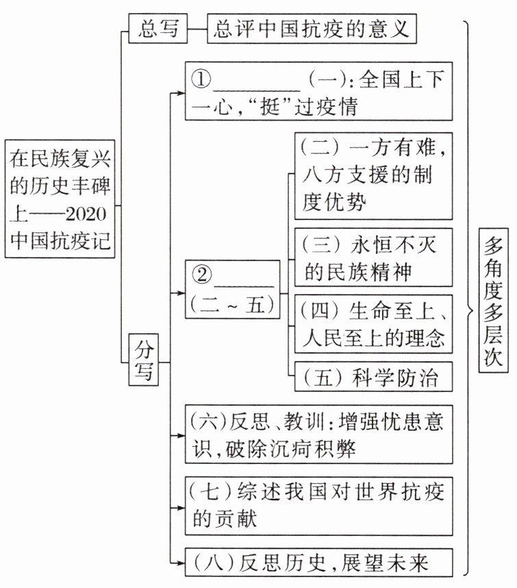 ①作者安排课文主体部分的顺序的依据是由宏观到具体,由内因到外因,突出了我们国家抗疫成功的主要因素。②党的领导是抗疫成功的根本保证;四面八方的支援与人民的不屈精神、医护人员的奉献精神,以及科学防治效果显著,都是党的正确领导的具体体现。抗疫的成功说明了我们国家的治理模式是成功的。合作抗疫虽是外因,但在战胜疫情中也起到了举足轻重的作用。