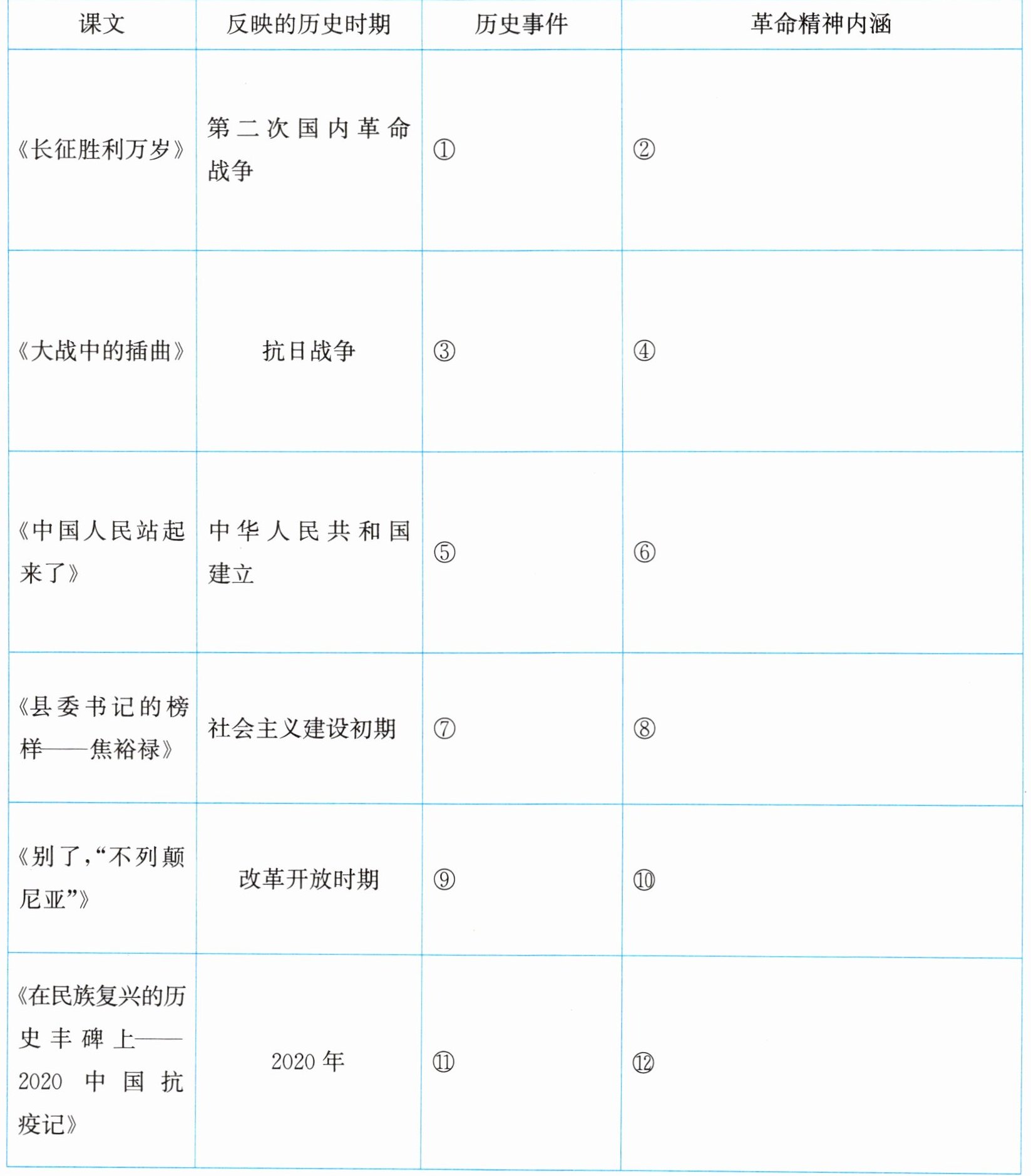 ①长征胜利结束 ②坚忍不拔、不怕牺牲的长征精神 ③聂荣臻将军救助日本小姑娘 ④革命的人道主义精神 ⑤中国人民政治协商会议第一届全体会议召开 ⑥建设新中国的豪情与自信 ⑦焦裕禄带领兰考人民同自然做斗争 ⑧艰苦奋斗、无私奉献、一心为民的焦裕禄精神 ⑨香港回归祖国 ⑩中华民族结束屈辱历史,无比强大的爱国主义精神 ⑪中国人民抗击新冠疫情 ⑫尊重生命、尊重科学、团结互助、坚强不屈的精神