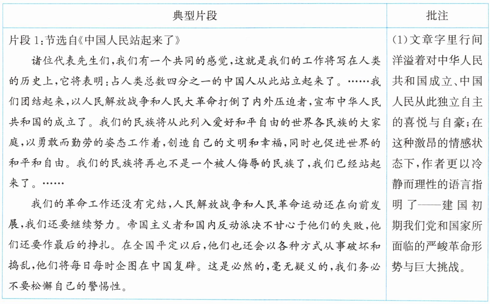 (1)文章字里行间洋溢着对中华人民共和国成立、中国人民从此独立自主的喜悦与自豪;在这种激昂的情感状态下,作者更以冷静而理性的语言指明了——建国初期我们党和国家所面临的严峻革命形势与巨大挑战。