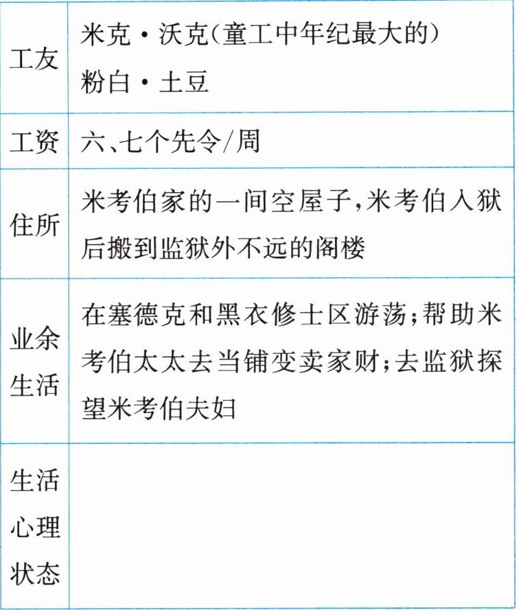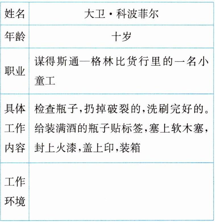 大卫·科波菲尔是小说的主人公,课文所选的第十一章里,主要是10岁的童工大卫的生存状态和心理状态的写照。请完成下面的表格,以更好地来了解大卫·科波菲尔这个人物形象。