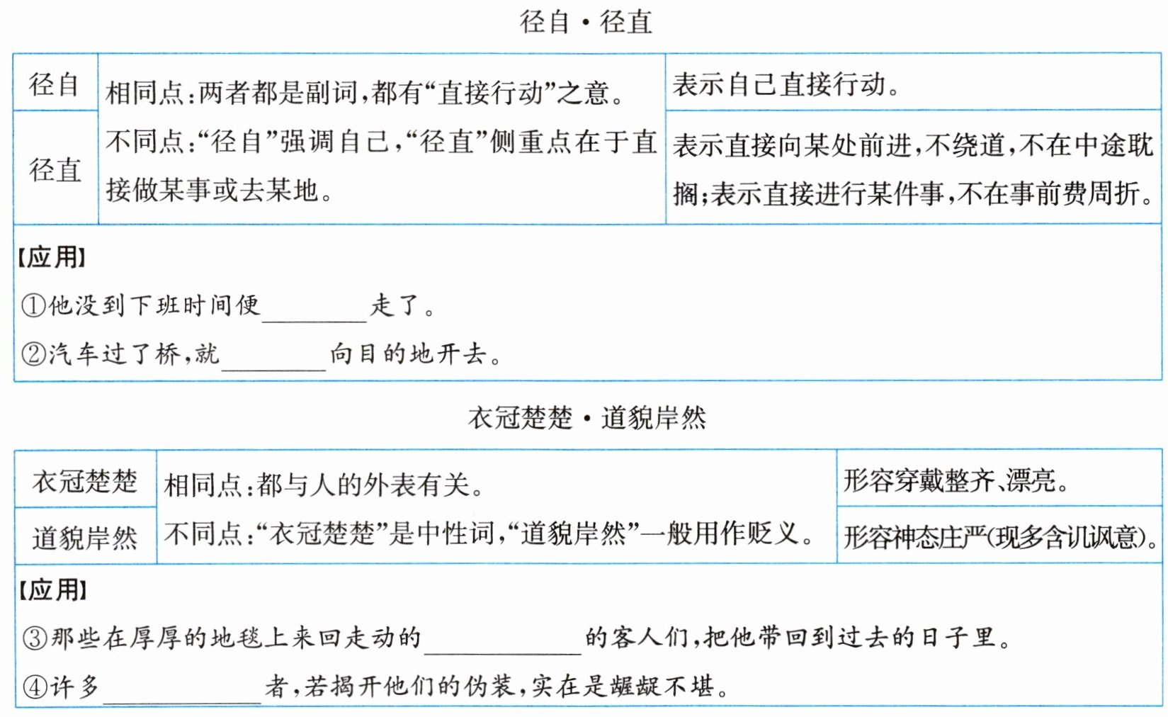 ①径自 ②径直 ③衣冠楚楚 ④道貌岸然