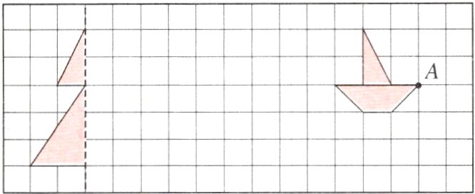 3. 画出轴对称图形的另一半,再将完整的图形向右平移6格,画出平移后的图形。将小船图绕A点逆时针方向旋转90°,画出旋转后的图形。