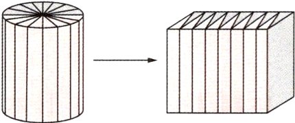 (1) 把圆柱切拼成一个近似的长方体,( )不变,这个长方体的长等于圆柱的( ),宽等于圆柱的( ),高等于圆柱的( ),所以圆柱的体积 = ( )×( )。用字母表示为V = ( ) = ( )。