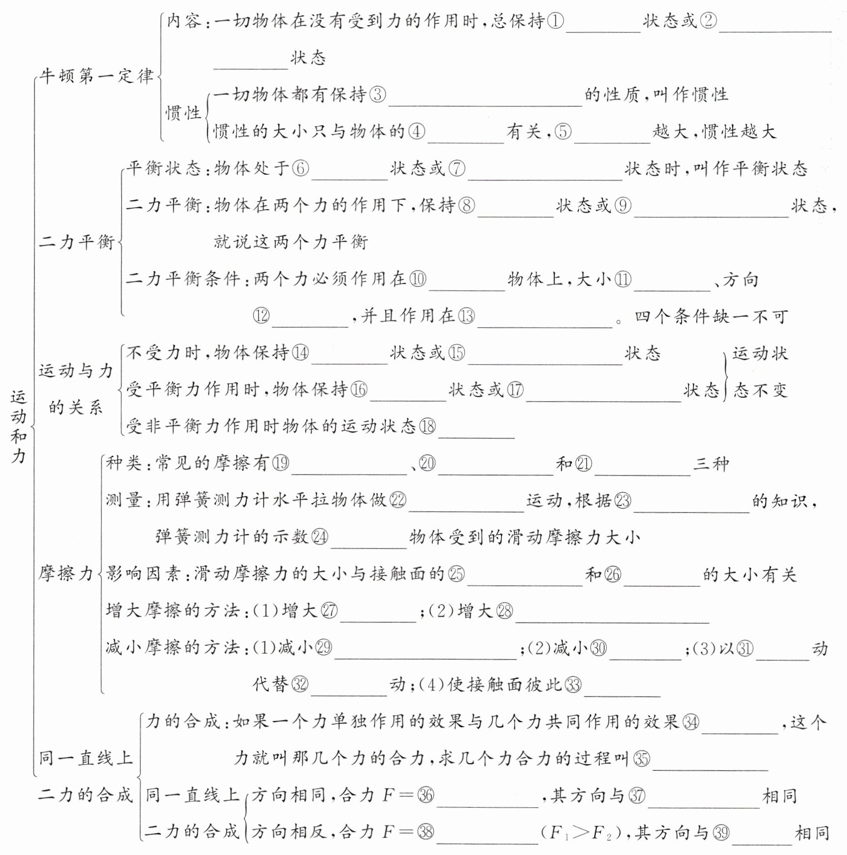 ①静止 ②匀速直线运动 ③原来运动状态不变 ④质量 ⑤质量 ⑥静 ⑦匀速直线运动 ⑧静止 ⑨匀速直线运动 ⑩同一 ⑪相等 ⑫相同 ⑬同一直线上 ⑭静止 ⑮匀速直线运动 ⑯静止 ⑰匀速直线运动 ⑱改变 ⑲滚动摩擦 ⑳滑动摩擦 ㉑静摩擦 ㉒匀速直线 ㉓二力平衡 ㉔等于 ㉕粗糙程度 ㉖压力 ㉗压力 ㉘接触 ㉙接触面的粗糙程度 ㉚压力 ㉛滚 ㉜滑 ㉝分离 ㉞相同 ㉟力的合成 F₁ + F₂ ㊱F₁或F₂ ㊲F₁ - F₂ ㊳F₁