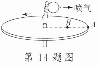 14.(淮北月考)如图所示,某人手持大气球站在转盘上,松开气嘴,让气球沿垂直转盘半径的方向喷气,发现自己与转盘一起反向转动,出现这种现象的原因是力的作用是________的。在A、B两点中,他站在______(选填“A”或“B”)点更容易转动,说明力的__________会影响力的作用效果。