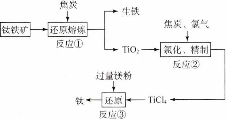 9.新考向 工艺流程 我国首款完全自主知识产权民用客机C919飞机上钛合金得到了广泛的应用。钛因其硬度大、熔点高,常温下不和非金属、强酸反应,被誉为“未来金属”。以钛铁矿(主要成分为钛酸亚铁,化学式为FeTiO₃)、焦炭、氧气为原料,提取金属钛的主要工艺过程一般需要经过三个阶段: