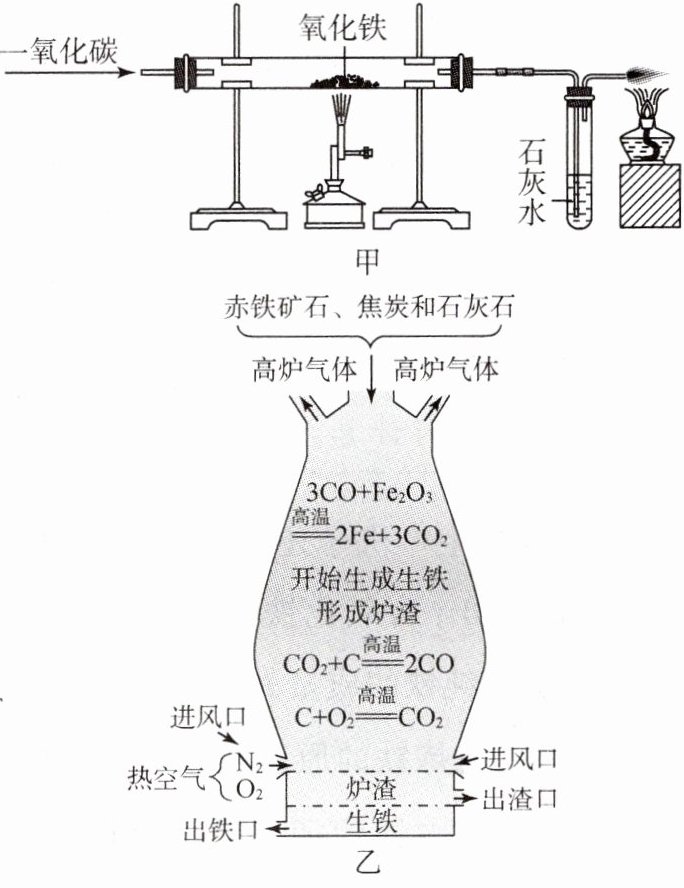 B.乙图中高炉炼铁的原料中焦炭的作用只是利用其燃烧提供热量