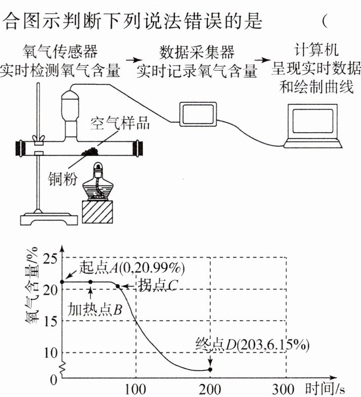 4.新考向 数字化实验为探究铜的化学性质,某同学借助氧气传感器在密闭装置中进行如图所示实验,观察实验现象并分析氧气含量随时间变化的曲线图。其中终点D(203,6.15%)表示时间为203秒时,装置中氧气含量为6.15%。结合图示判断下列说法错误的是 ( )