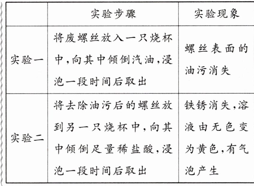 |实验一:将废螺丝放入一只烧杯中,向其中倾倒汽油,浸泡一段时间后取出|螺丝表面的油污消失|