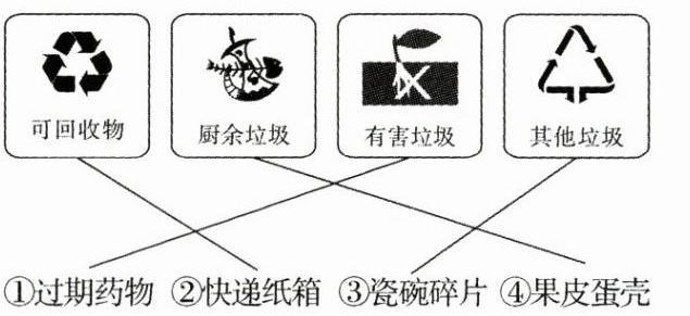 (1)同学们参观了垃圾处理厂,学习垃圾分类方法。将垃圾分类处理后能得到很多可再利用的资源,请将下列废弃物与对应垃圾种类连线。