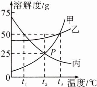 (1)P点表示的含义为__________________________。$t_1℃$时,甲、乙、丙三种物质的溶解度由小到大的顺序是________________。