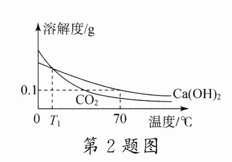 C.将70 ℃时等质量的$CO_2$和$Ca(OH)_2$饱和溶液降温到$T_1℃$,所得溶液中溶质的质量相等