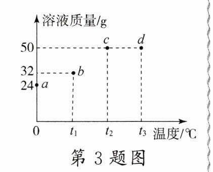 3.(2024·合肥三模)将34 g晶体W(不含结晶水)投入盛有16 g不同温度水的烧杯中(忽略溶解吸热、放热),充分溶解,测得0 ℃、$t_1℃$、$t_2℃$、$t_3℃$的烧杯中溶液的质量分别如图中a、b、c、d点所示。下列说法错误的是 ( )