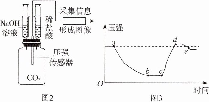 (5)丙同学用如图2装置进行实验,实验时先后将两种溶液快速推入,瓶内压强变化如图3所示。
