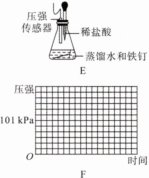 (5)为进一步探究铁钉锈蚀过程中气态物质的变化,该小组按示意图E所示装置完成以下实验。恒温下,向锥形瓶中加入少量稀盐酸,同时测量锥形瓶内气体压强随时间的变化,直至反应完全。