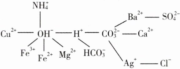 (2)溶液酸碱性或pH:使紫色石蕊溶液变红或pH<7,说明溶液中存在____$H^{+}$____(填离子符号,下同);使紫色石蕊溶液变蓝、使酚酞溶液变红或pH>7,说明溶液中存在____$OH^{-}$____。