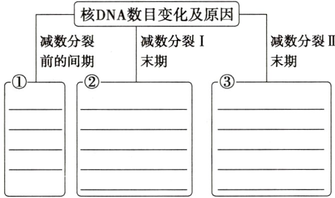 (2)DNA复制,核DNA数目加倍 核DNA随同源染色体分离,并分别进入两个子细胞中,核DNA数目减半 着丝粒分裂,染色体上的DNA分开,分别进入两个子细胞,数量再减半