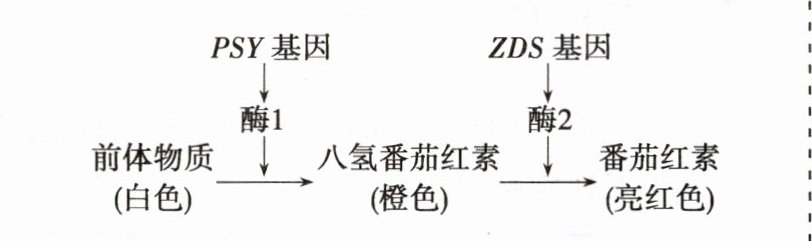 13.D 解析:假设八氢番茄红素合成酶基因(PSY)用A/a表示,胡萝卜脱氢酶基因(ZDS)用B/b表示。$A_B_$表现为亮红色,$A_bb$表现为橙色,$aa_ _$表现为白色。若某一转基因植株自交后代中橙色大米:亮红色大米:白色大米的比例为3:12:1时,属于9:3:3:1的变式,有一个PSY和一个ZDS分别插入到2条非同源染色体上,且目的基因多次插入,则可能有PSY、ZDS插在同一条染色体上,A错误;一个PSY和一个ZDS分别插入到2条非同源染色体上,假定转入PSY基因的用A表示,没有转入PSY基因的用a表示,转入ZDS基因的用B表示,没有转入ZDS基因的用b表示,转基因水稻的基因型是AaBb,由于遵循自由组合定律,自交后代的基因型及比例是$A_B_$:$A_bb$:aaB_:aabb=9:3:3:1,$A_B_$含有两种目的基因,表现为亮红色,$A_bb$只含有PSY基因,表现为橙色,$aaB_、$aabb为白色,自交后代中白色大米:橙色大米:亮红色大米的比例为4:3:9,B错误;若某一转基因植株自交后代中出现白色大米:亮红色大米的比例为1:15,不一定有PSY、ZDS插在同一条染色体上,如